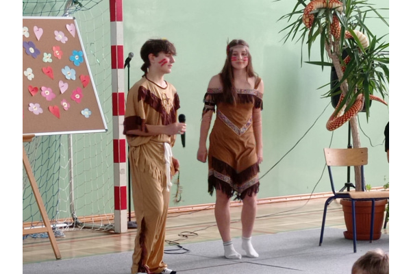 10marca w naszej szkole w związku z obchodami Dnia Kobiet odbył się humorystyczny montaż słowno-muzyczny pt: ,,Kwiatek dla …- przekrój przez epoki’’ w wykonaniu uczniów z kl.8.