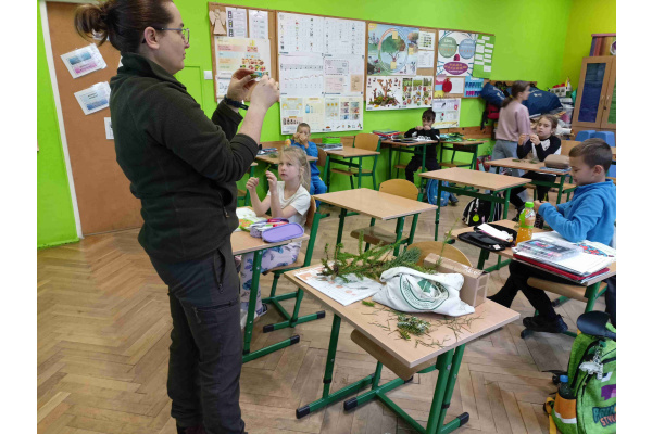 Uczniowie klasy 2 a czekali na pierwszą w tym roku szkolnym leśną wyprawę, ale pogoda nie pozwoliła nam na wyjście. Pani leśniczy była jednak przygotowana na alternatywne zajęcia. Przyniosła ze sobą mnóstwo wspaniałości. Poznaliśmy gatunki drzew iglastych i ich szyszki.