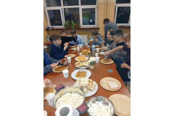 5 grudnia klasy 5b i 6 spotkały się o 18.30, by wspólnie spędzić wieczór. Były różne zabawy, pyszna pizza, gofry, tosty, słodkości. Uczniowie z ogromnym zaangażowaniem przygotowywali również kartki świąteczne dla pacjentów szpitala oraz ozdabiali pierniczki słuchając świątecznej muzyki.