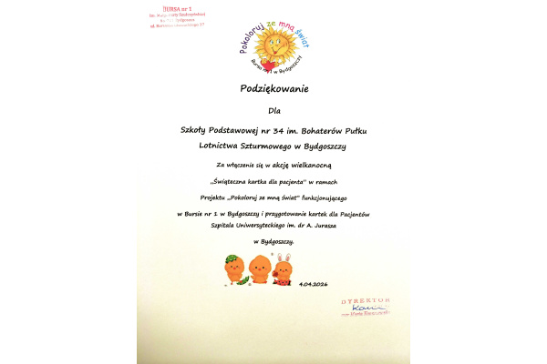 Kolejny raz nasza szkoła dołączyła do akcji pt. "Świąteczna kartka dla Pacjenta” organizowanej przez Bursę nr 1 im. Małgorzaty Szułczyńskiej w Bydgoszczy w ramach projektu „Pokoloruj ze mną Świat".