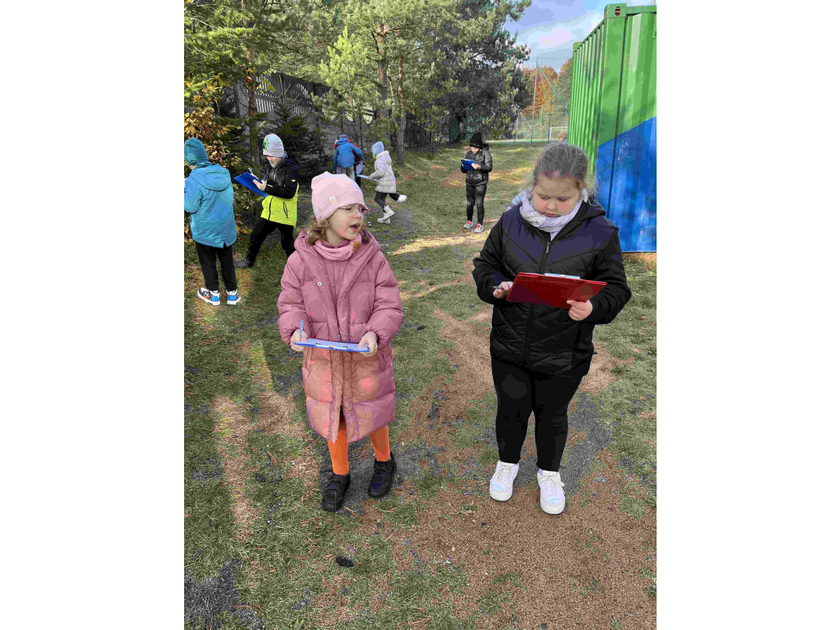 Uczniowie z klasy 2b w ramach realizacji edukacji przyrodniczej, wybrali się na ,,Jesienne polowanie”. Zadaniem dzieci było uzupełnianie kart pracy w terenie. Szukały oznak i symboli związanych z obecną porą roku w zakresie 3 kategorii: ZOBACZ, POCZUJ, USŁYSZ. Poza poszukiwaniem, uczniowie mieli również podać dwa symbole, które nie były zawarte w karcie, a zostały samodzielnie znalezione przez małych detektywów przyrody. Zabawa okazała się ciekawym i radosnym doświadczeniem dla wszystkich.