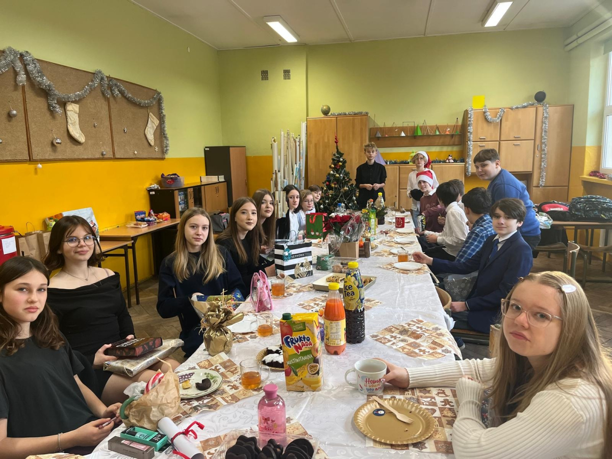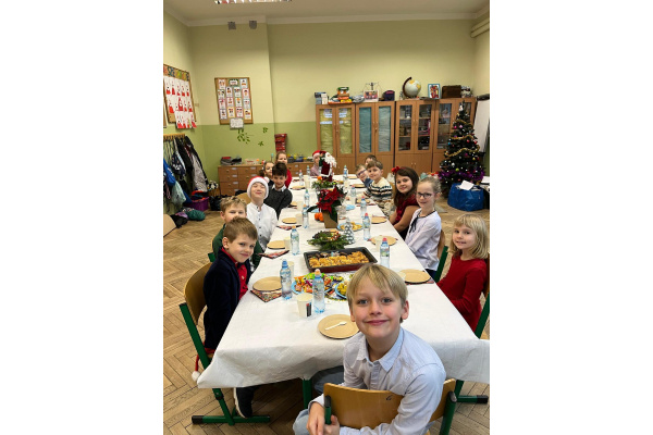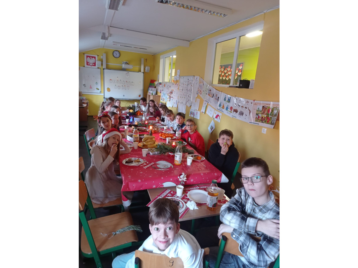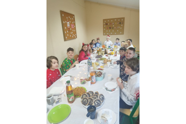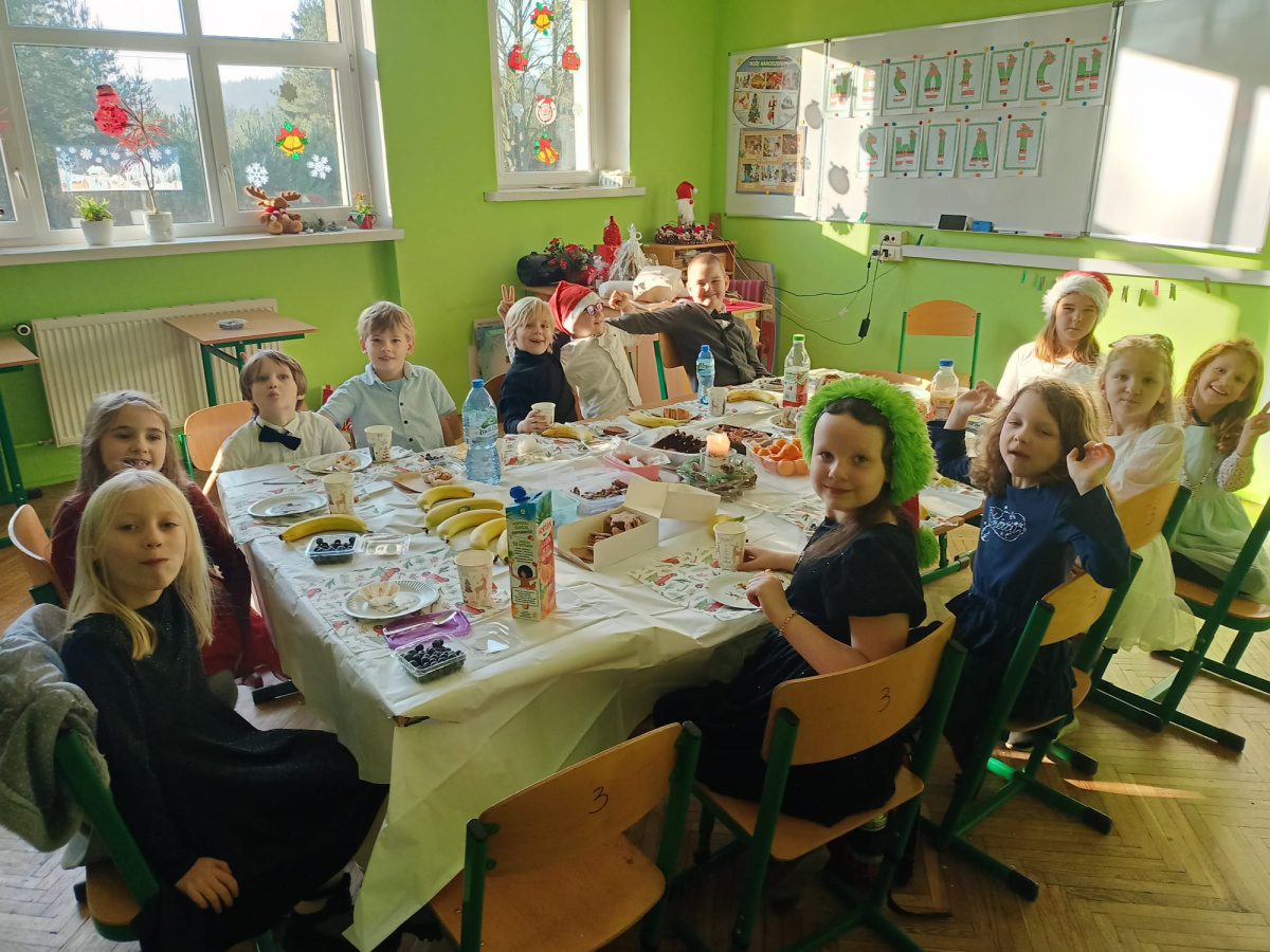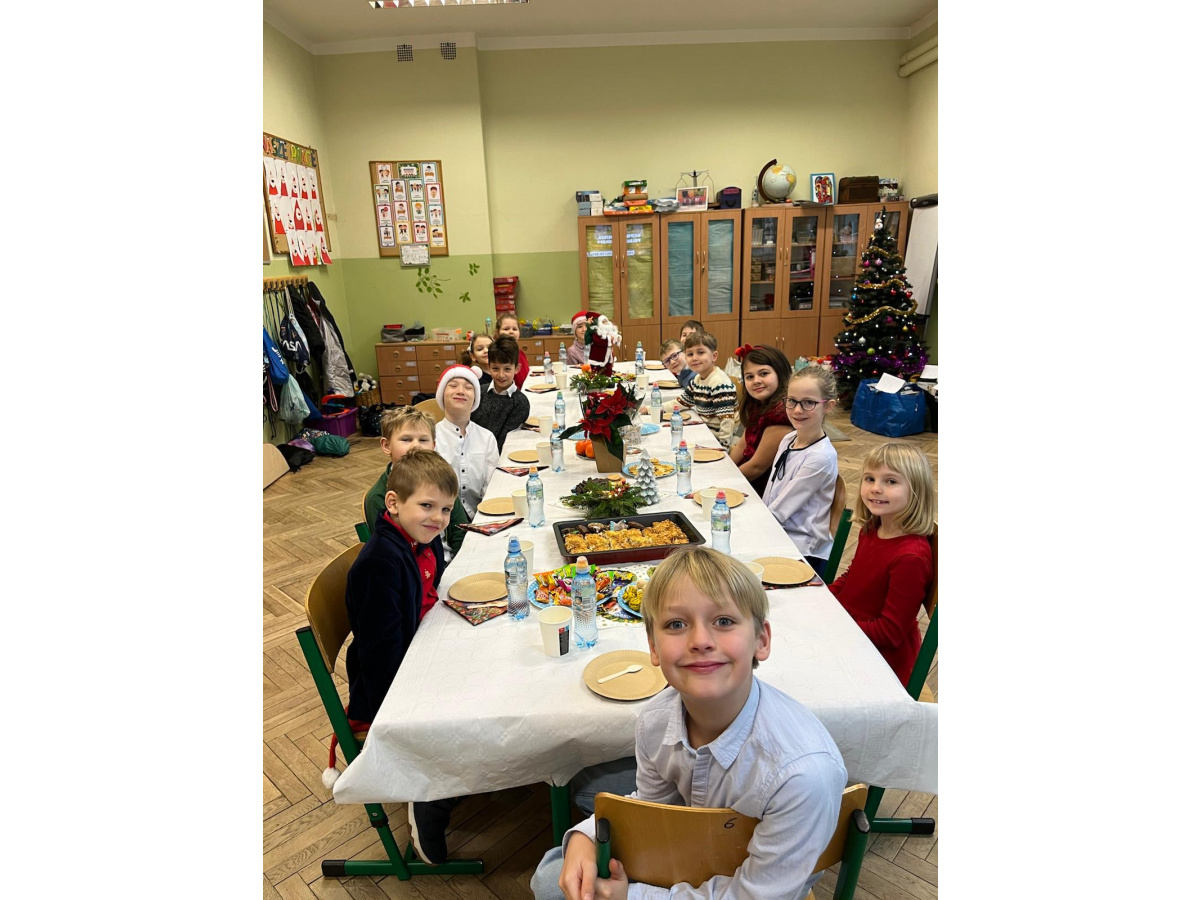 19 grudnia 2025 roku był niezwykle świątecznym dniem w naszej szkole. Wszystkie klasy zasiadły do pięknie przygotowanych przez siebie nakrytych wigilijnych stołów, które aż uginały się od pyszności. Dzieci wymieniały się prezentami, śpiewały kolędy, dzieliły się opłatkiem, składały sobie życzenia oraz zajadały przygotowane potrawy. Ten dzień pozostanie na długo w pamięci niejednego ucznia.