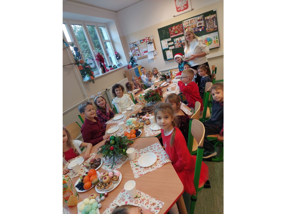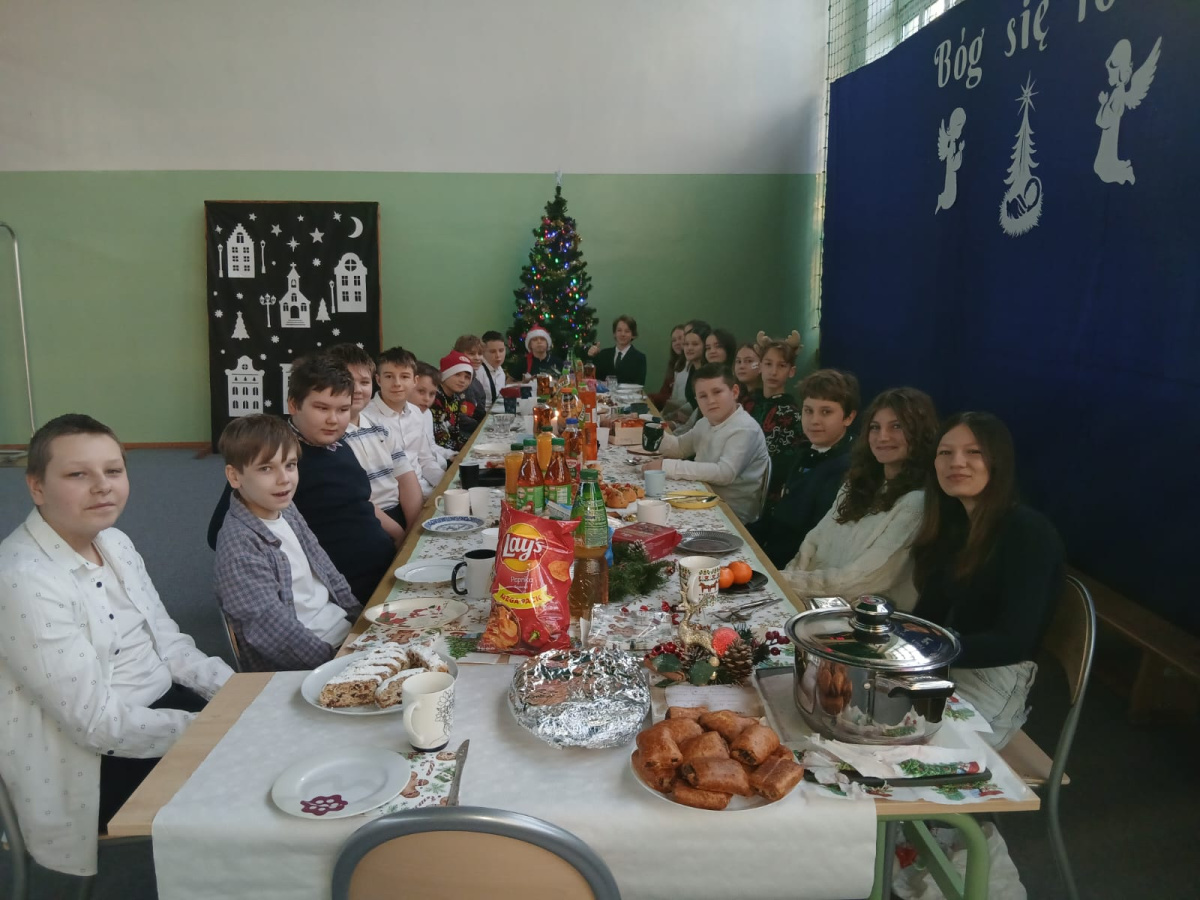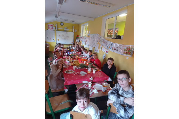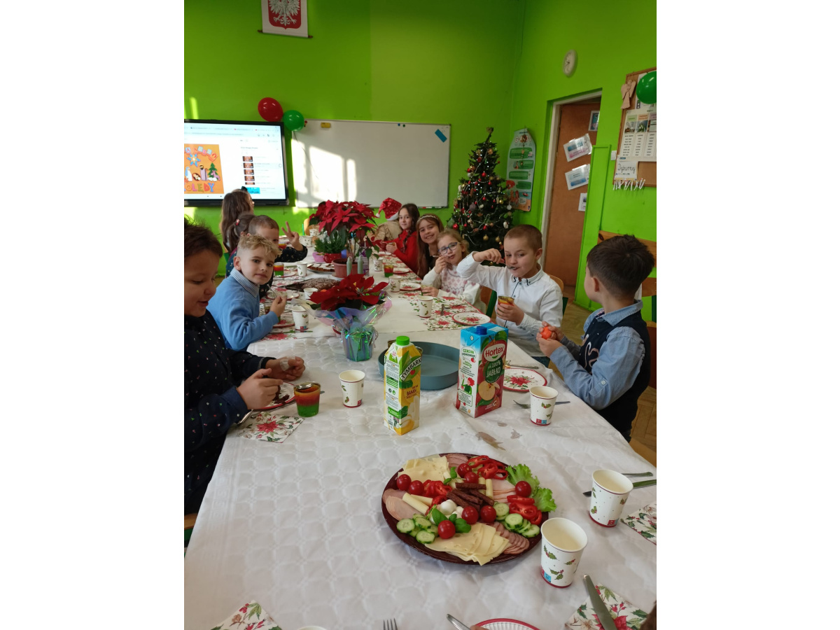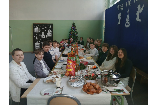 19 grudnia 2025 roku był niezwykle świątecznym dniem w naszej szkole. Wszystkie klasy zasiadły do pięknie przygotowanych przez siebie nakrytych wigilijnych stołów, które aż uginały się od pyszności. Dzieci wymieniały się prezentami, śpiewały kolędy, dzieliły się opłatkiem, składały sobie życzenia oraz zajadały przygotowane potrawy. Ten dzień pozostanie na długo w pamięci niejednego ucznia.