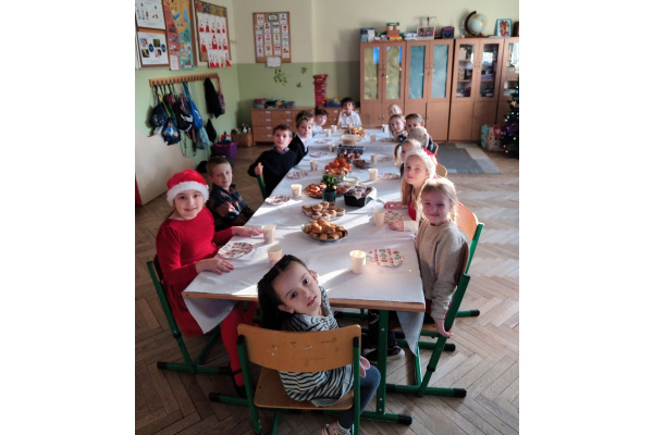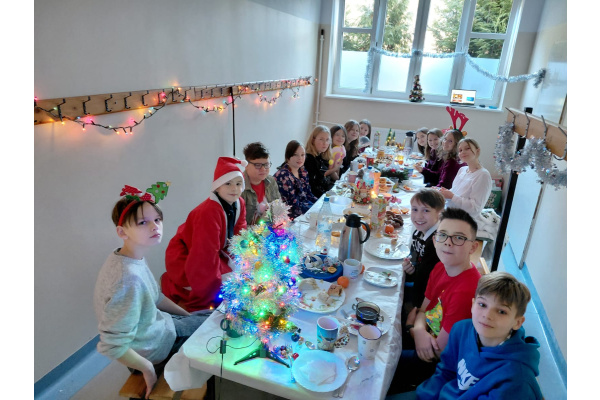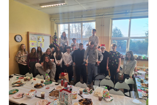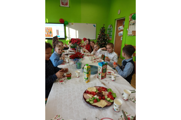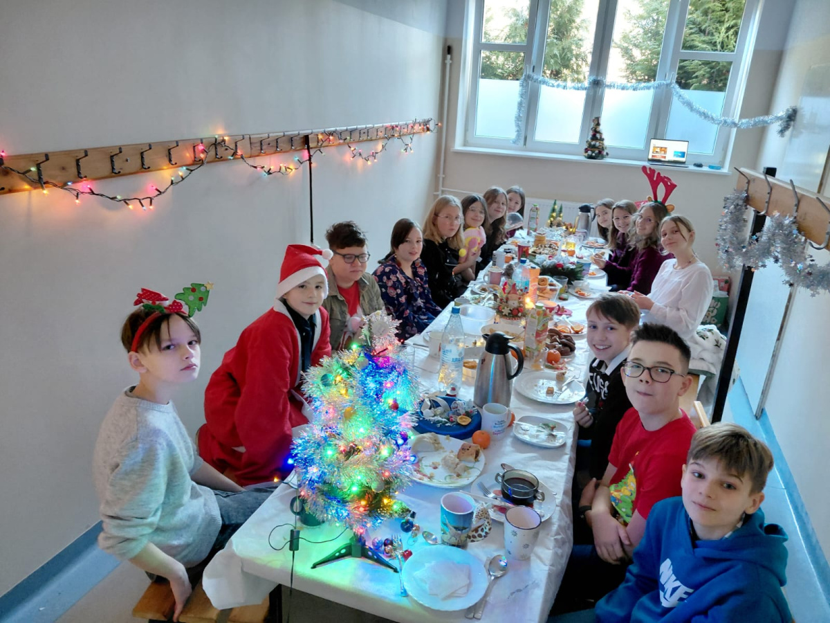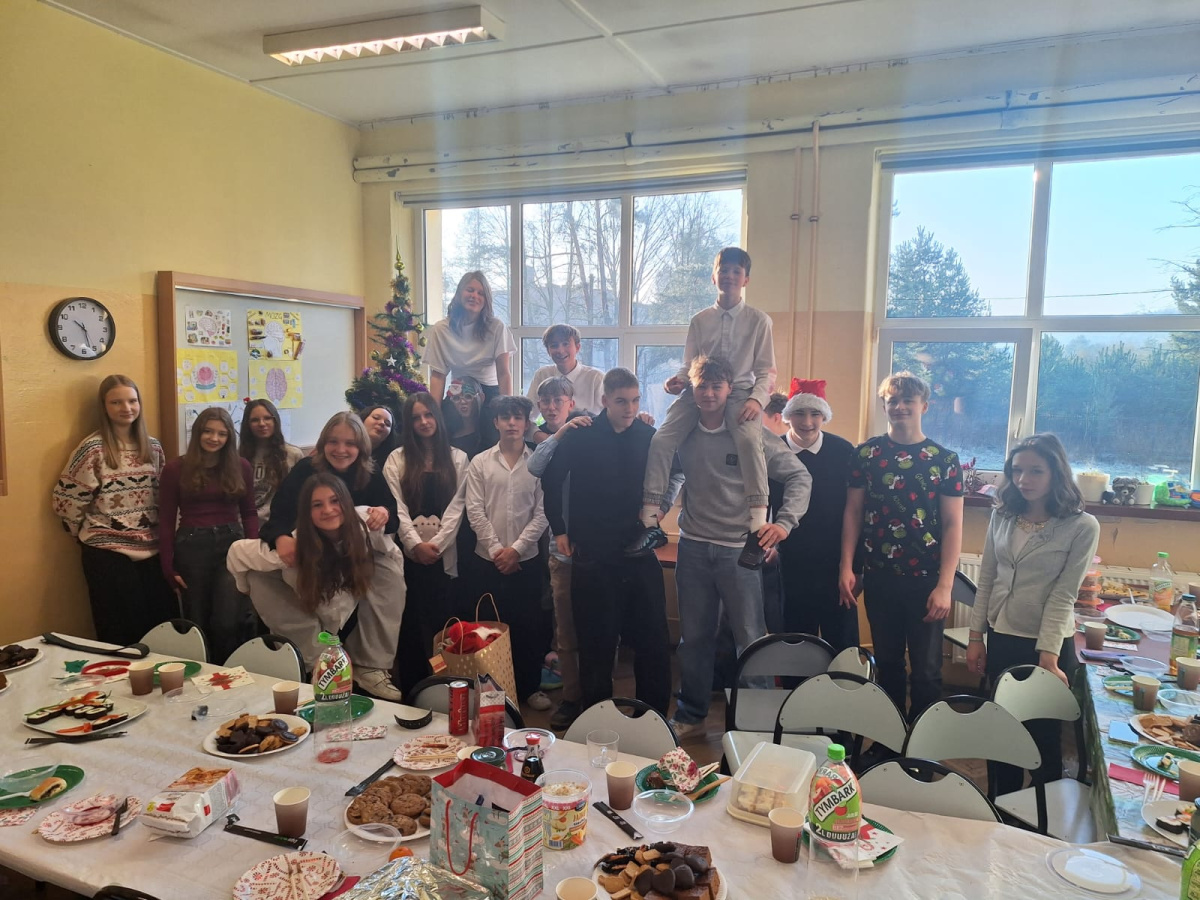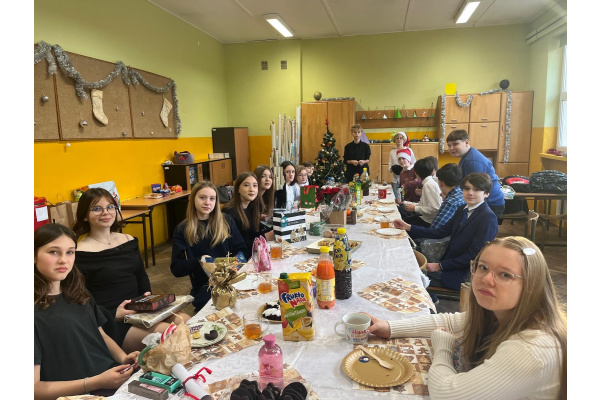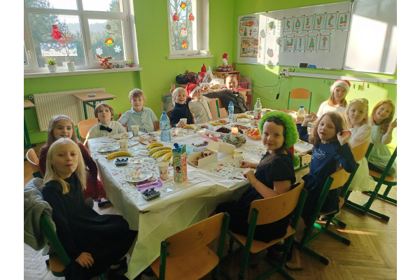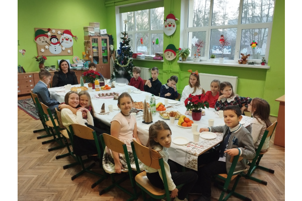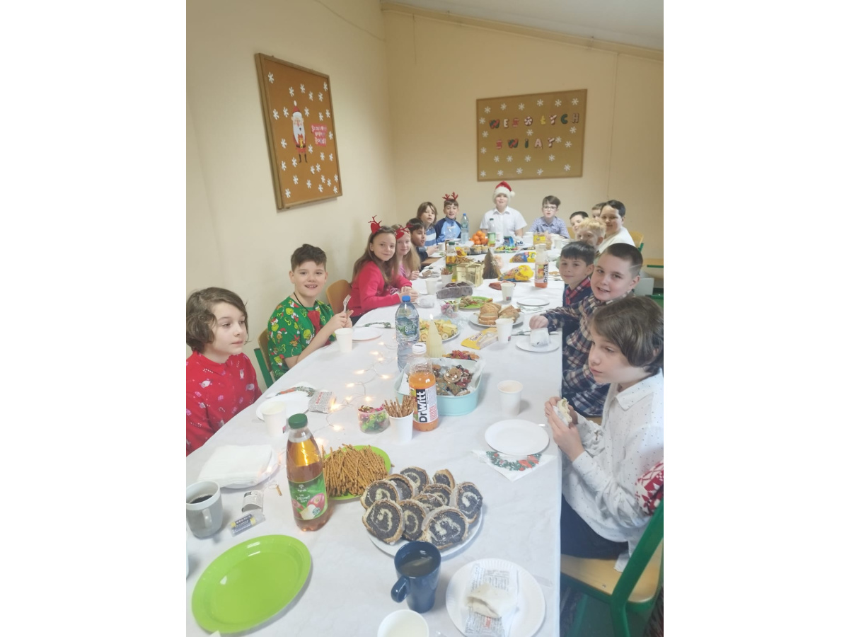19 grudnia 2025 roku był niezwykle świątecznym dniem w naszej szkole. Wszystkie klasy zasiadły do pięknie przygotowanych przez siebie nakrytych wigilijnych stołów, które aż uginały się od pyszności. Dzieci wymieniały się prezentami, śpiewały kolędy, dzieliły się opłatkiem, składały sobie życzenia oraz zajadały przygotowane potrawy. Ten dzień pozostanie na długo w pamięci niejednego ucznia.
