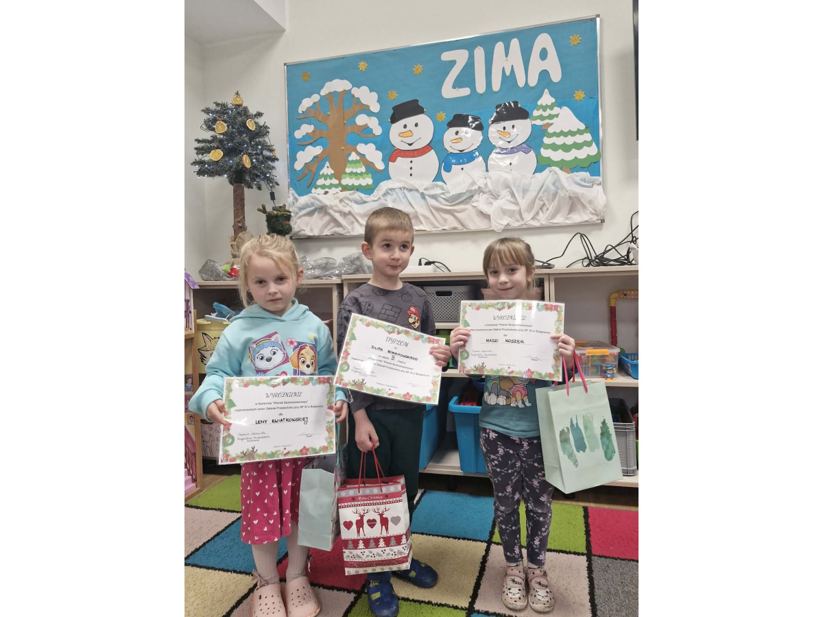 W grudniu w naszym przedszkolu rozstrzygnięty został konkurs na wianek bożonarodzeniowy. Zgłoszone zostały 23 piękne prace, za co serdecznie dziękujemy! Dla osób, których wianki zdobyły miejsca 1-3 oraz dla autorów prac wyróżniknych przygotowane zostały dyplomy i nagrody rzeczowe. Wszyscy pozostali uczestnicy otrzymali dyplom i drobny upominek. Dziękujemy i gratulujemy!