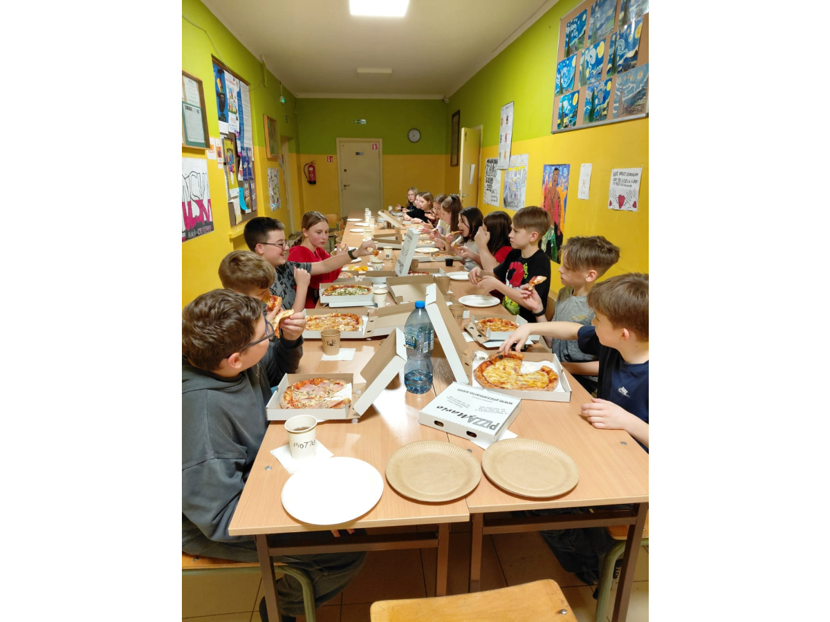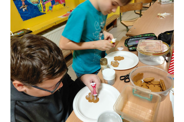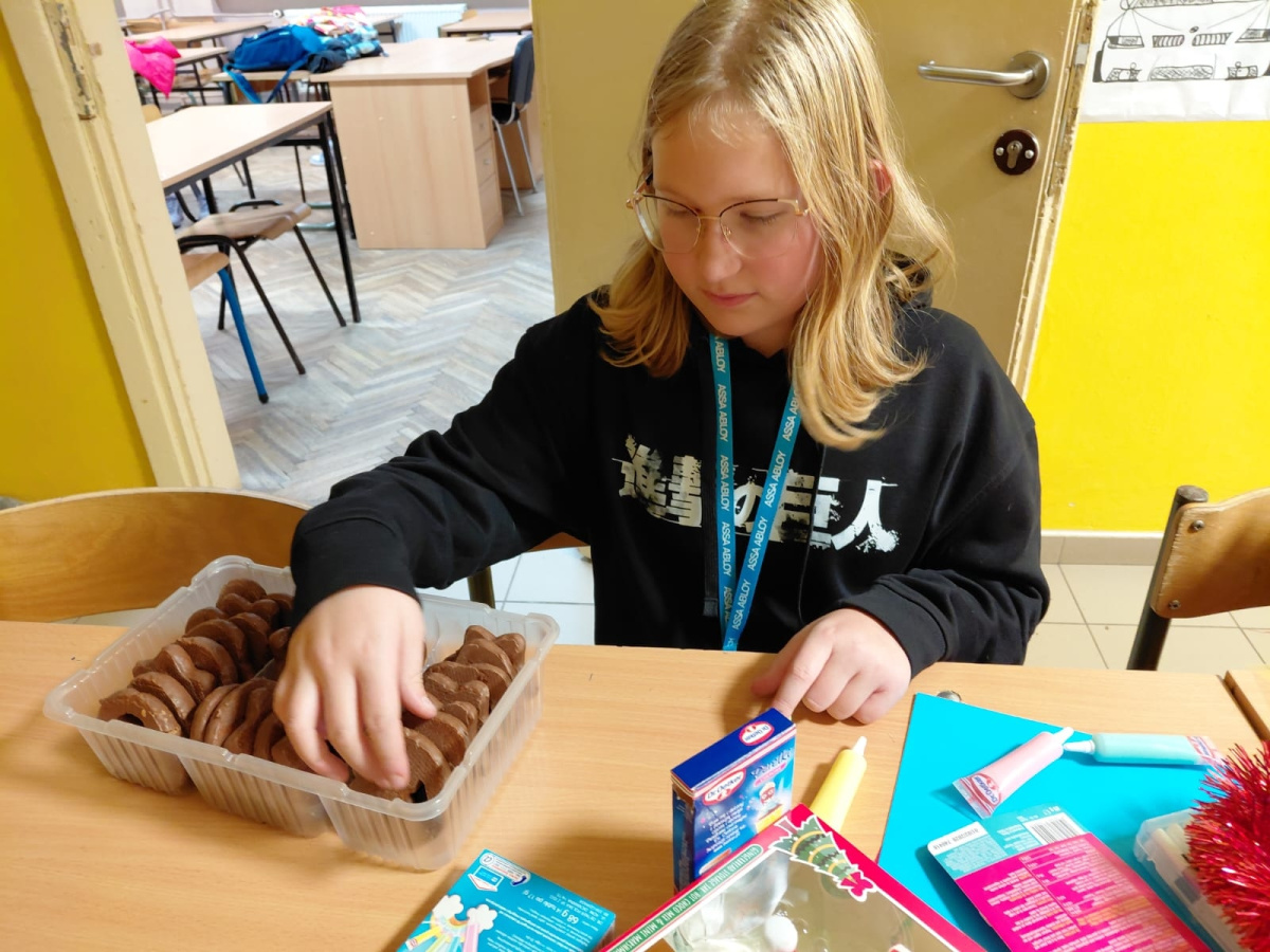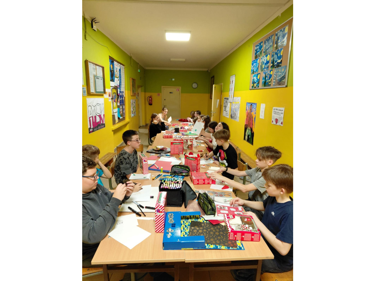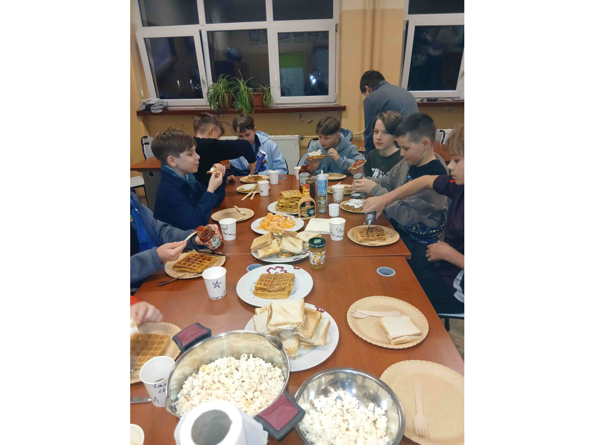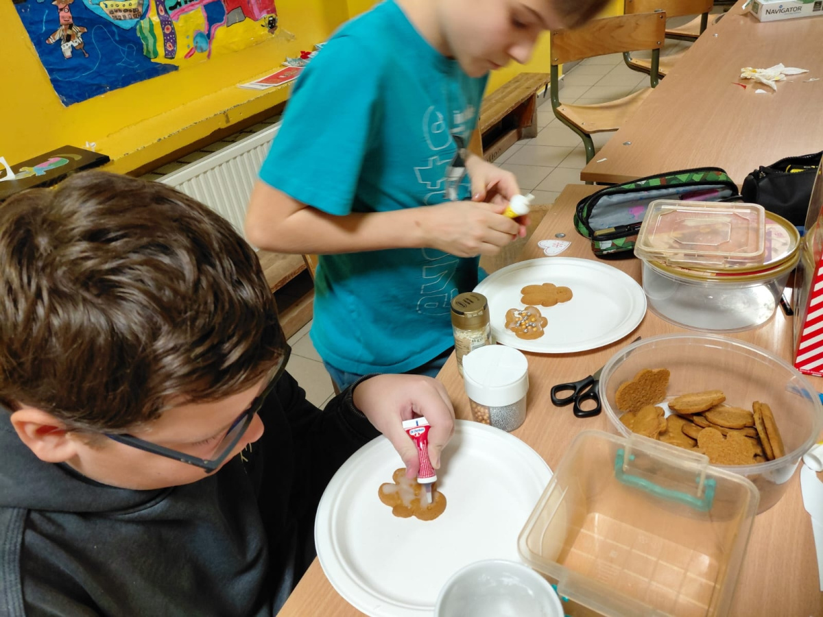 5 grudnia klasy 5b i 6 spotkały się o 18.30, by wspólnie spędzić wieczór. Były różne zabawy, pyszna pizza, gofry, tosty, słodkości. Uczniowie z ogromnym zaangażowaniem przygotowywali również kartki świąteczne dla pacjentów szpitala oraz ozdabiali pierniczki słuchając świątecznej muzyki. Na piątoklasitów podczas wieczoru czekała dodatkowa niespodzianka-prezenty od Św. Mikołaja.