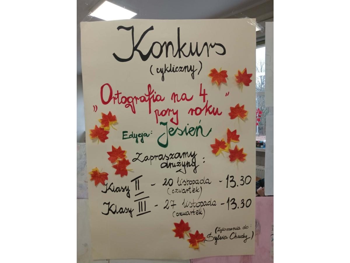 W czwartek 20 listopada, rozpoczął się cykliczny konkurs dla klas 2 i 3 - " Ortografia na 4 pory roku". Tym razem w edycji Jesień, swoje zmagania zespołowe z ortografią, miały klasy drugie. Klasy trzecie spotkają się 27 listopada. Kolejne edycje w lutym, kwietniu i czerwcu. Przedstawiciele klas zbierają punkty za ortografię, tempo pracy i pracę w zespole.Podsumowanie konkursu odbędzie się na koniec roku szkolnego! Życzymy Powodzenia!
