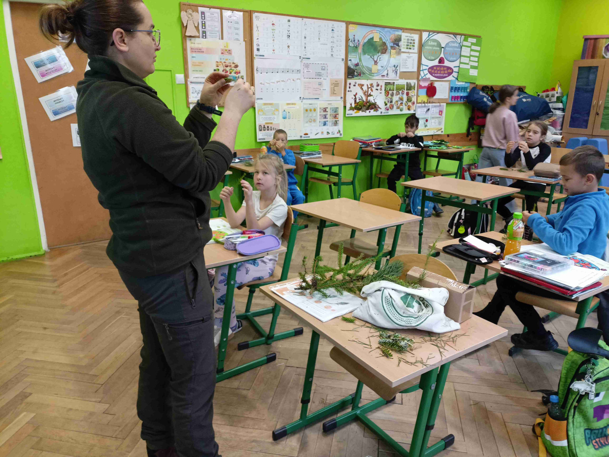 Uczniowie klasy 2a czekali na pierwszą w tym roku szkolnym leśną wyprawę, ale pogoda nie pozwoliła nam na wyjście. Pani leśniczy była jednak przygotowana na alternatywne zajęcia. Przyniosła ze sobą mnóstwo wspaniałości. Poznaliśmy gatunki drzew iglastych i ich szyszki.