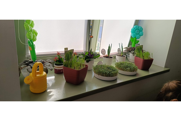 Wiosennie zrobiło się w naszej sali. Wyrosła rzeżucha, owies, kwitły kwiatki, które zasialiśmy aby nowa pora roku do nas przybyła.