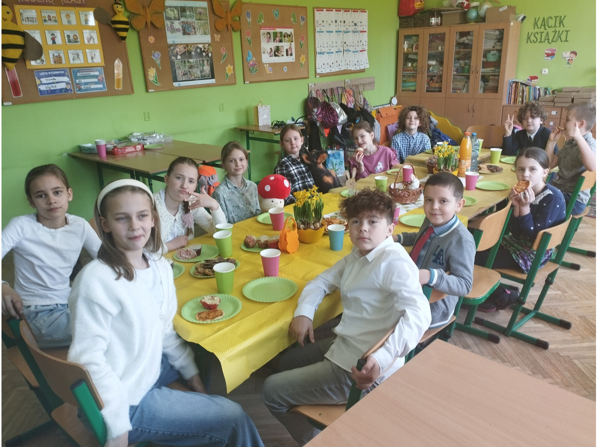 Przed przerwą świąteczną uczniowie klasy 3a wraz z paniami zasiedli do śniadania wielkanocnego. Na stole nie zabrakło tradycyjnych wielkanocnych przysmaków. Znalazły się również piękne świąteczne ozdoby i dekoracje. Dzieci złożyły sobie życzenia i z ochotą skosztowały przygotowanych przez rodziców smakołyków. Poznały także symbolikę potraw. Pojawił się też zajączek, który zostawił dzieciom upominki. Czas upłynął w miłej atmosferze i wprowadził wszystkich w świąteczny nastrój.