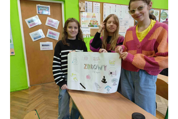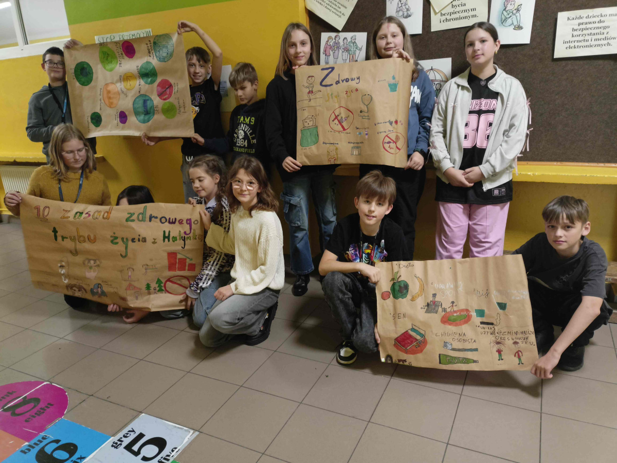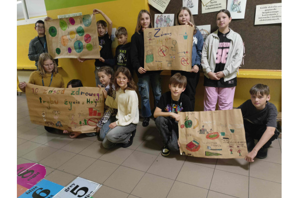 Uczniowie kl. Va i Vb wykonali plakaty dotyczące zasad zdrowego trybu życia, podkreślając znaczenie ruchu, snu, zdrowego odżywiania, higieny i dobrego samopoczucia psychicznego, a także promowali spożywanie owoców, warzyw i produktów mlecznych. Działania te miały na celu edukację i zachęcenie do prozdrowotnych nawyków w ramach lekcji edukacji zdrowotnej.