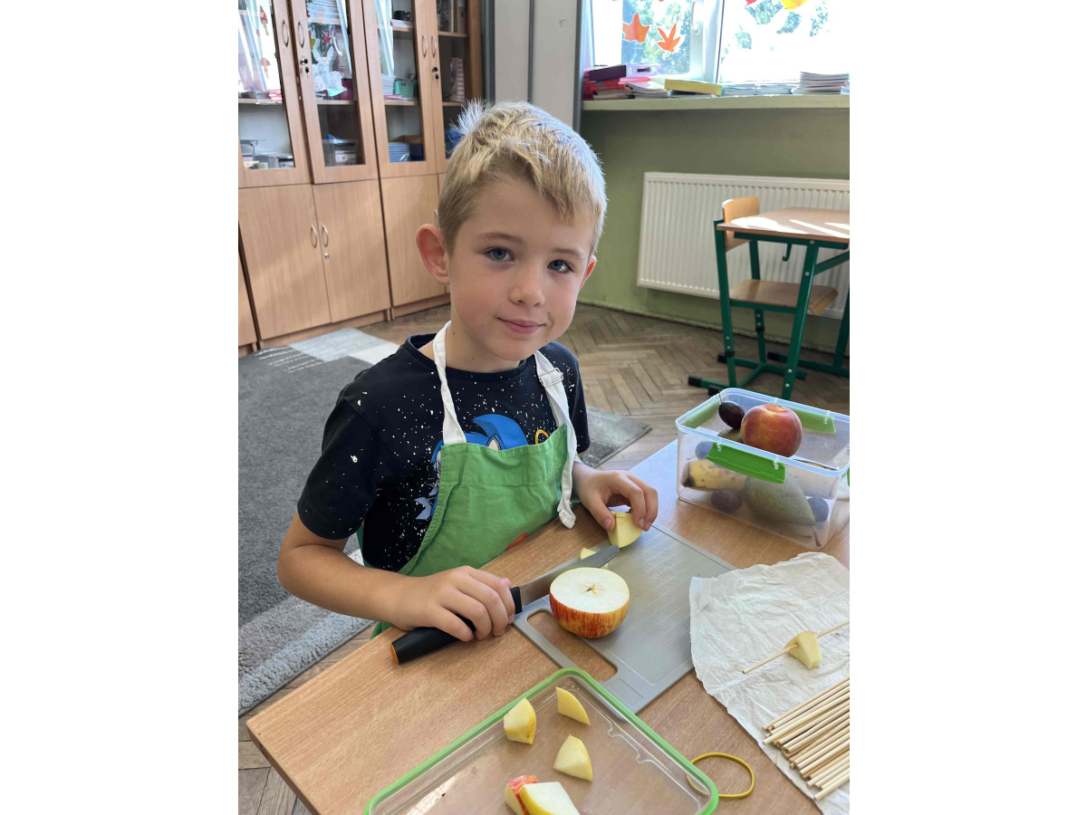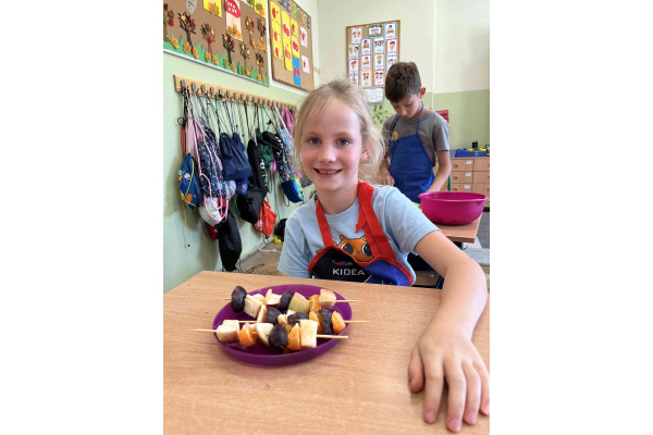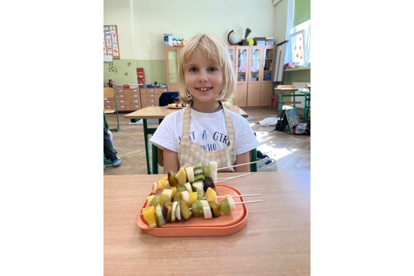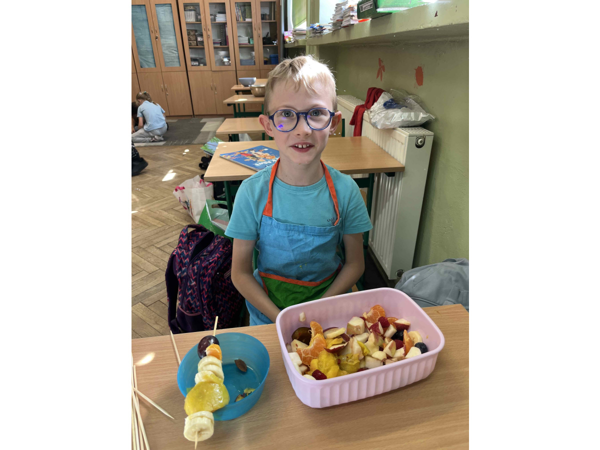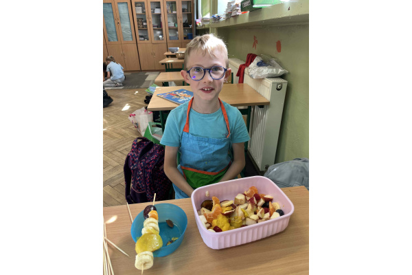 W ramach realizacji tematu ,,Zdrowie z sadu i ogrodu”, uczniowie z klasy 2 b postanowili przygotować szaszłyki owocowe oraz sałatki. Dzieci przyniosły swoje ulubione owoce i z dużym zapałem zabrały się do pracy. Przy okazji utrwaliły sobie nazwy wielu owoców. W sali zrobiło się kolorowo i pachnąco. Punktem najważniejszym była degustacja własnoręcznie przyrządzonych potraw.