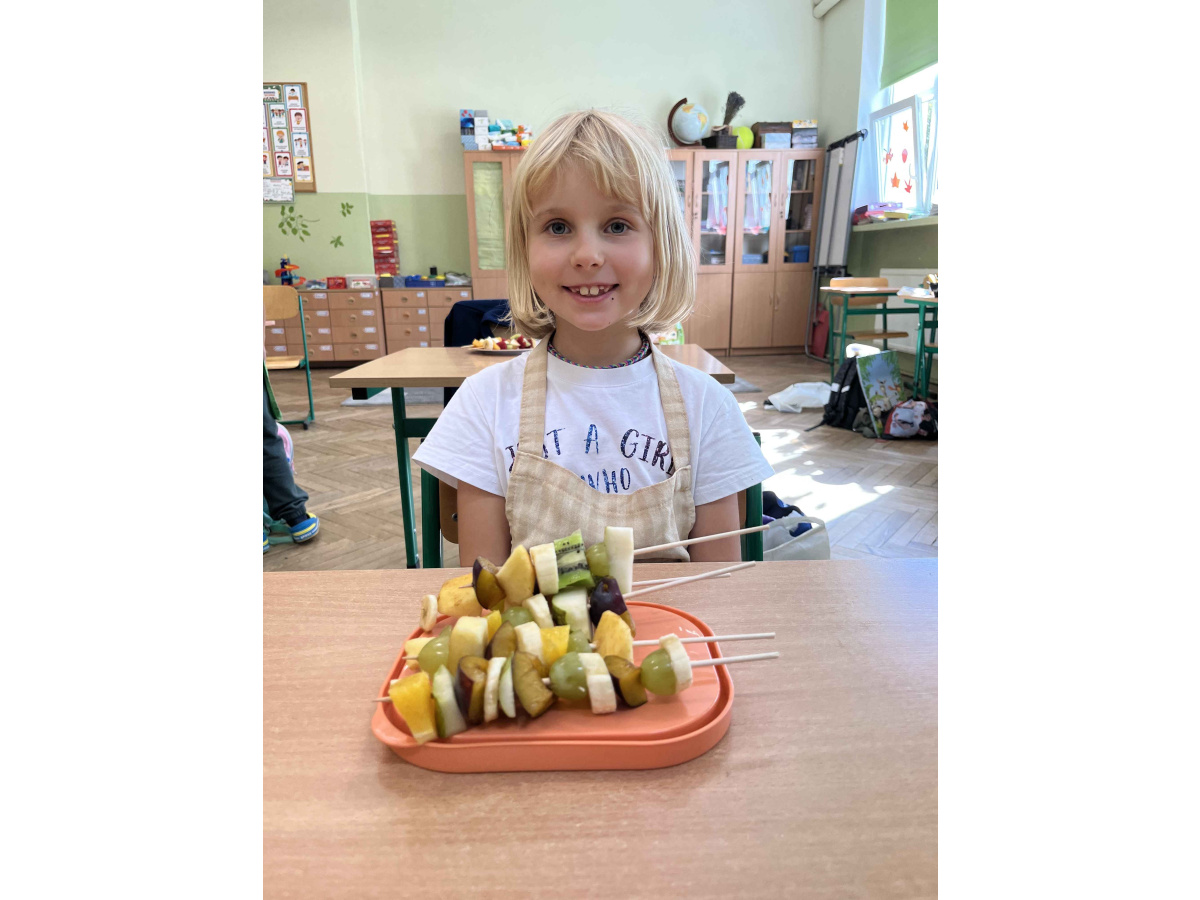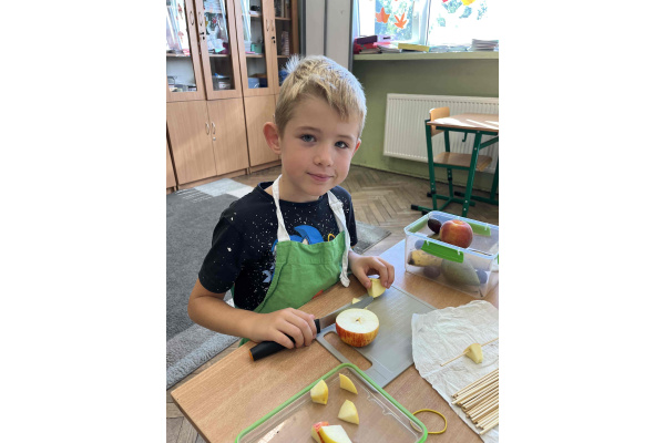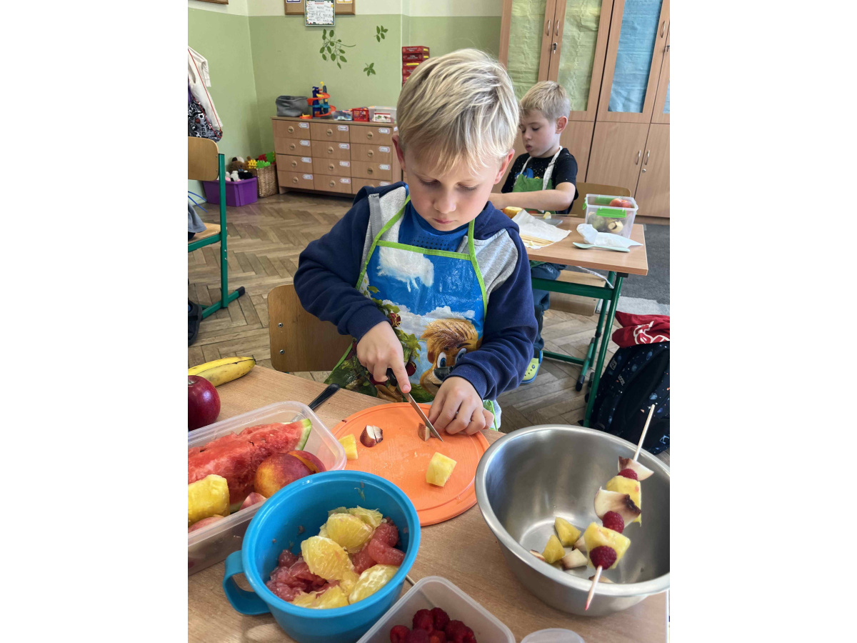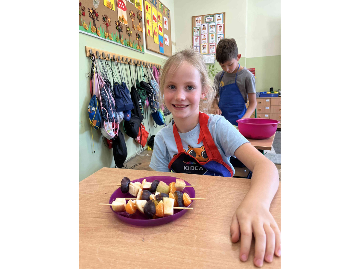 W ramach realizacji tematu ,,Zdrowie z sadu i ogrodu”, uczniowie z klasy 2 b postanowili przygotować szaszłyki owocowe oraz sałatki. Dzieci przyniosły swoje ulubione owoce i z dużym zapałem zabrały się do pracy. Przy okazji utrwaliły sobie nazwy wielu owoców. W sali zrobiło się kolorowo i pachnąco. Punktem najważniejszym była degustacja własnoręcznie przyrządzonych potraw.